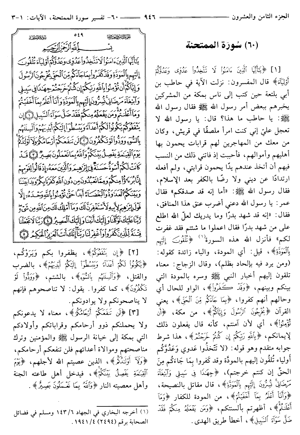 (60) سورة الممتحنة [1] {يَا أَيُّهَا الَّذِينَ آمَنُوا لَا تَتَّخِذُوا عَدُوِّي وَعَدُوَّكُمْ أَوْلِيَاءَ} [الممتحنة: 1] قَالَ الْمُفَسِّرُونَ: نَزَلَتِ الْآيَةُ فِي حَاطِبِ بْنِ أَبِي بَلْتَعَةَ حِينَ كتب إِلَى نَاسٍ بِمَكَّةَ مِنَ الْمُشْرِكِينَ يُخْبِرُهُمْ بِبَعْضِ أَمْرِ رَسُولِ اللَّهِ صَلَّى اللَّهُ عَلَيْهِ وَسَلَّمَ فَقَالَ رَسُولِ اللَّهِ صَلَّى اللَّهُ عَلَيْهِ وسلم: «يَا حَاطِبُ مَا هَذَا؟ " قَالَ: يَا رَسُولَ اللَّهِ لَا تَعْجَلْ عَلَيَّ إِنِّي كُنْتُ امْرَأً مُلْصَقًا في قريش، وَكَانَ مَنْ مَعَكَ مِنَ الْمُهَاجِرِينَ لَهُمْ قَرَابَاتٌ يَحْمُونَ بِهَا أَهْلِيهِمْ وَأَمْوَالَهَمْ، فَأَحْبَبْتُ إِذْ فَاتَنِي ذَلِكَ مِنَ النَّسَبِ فِيهِمْ أَنْ أَتَّخِذَ عِنْدَهُمْ يَدًا يَحْمُونَ قَرَابَتِي، وَلَمْ أَفْعَلْهُ ارْتِدَادًا عَنْ دِينِي وَلَا رِضًا بِالْكُفْرِ بَعْدَ الْإِسْلَامِ، فَقَالَ رَسُولِ اللَّهِ صَلَّى اللَّهُ عَلَيْهِ وَسَلَّمَ: "أَمَا إِنَّهُ قَدْ صَدَقَكُمْ" فَقَالَ عُمَرُ: يَا رَسُولَ اللَّهِ دَعْنِي أَضْرِبْ عُنُقَ هَذَا الْمُنَافِقِ، فَقَالَ: "إِنَّهُ قَدْ شَهِدَ بَدْرًا وَمَا يُدْرِيكَ لَعَلَّ اللَّهَ اطَّلَعَ عَلَى مَنْ شَهِدَ بَدْرًا فَقَالَ اعْمَلُوا مَا شِئْتُمْ فَقَدْ غَفَرْتُ لكم» فأنزل الله هذه السورة (¬1) {تُلْقُونَ إِلَيْهِمْ بِالْمَوَدَّةِ} [الممتحنة: 1] قِيلَ: أَيِ الْمَوَدَّةَ، وَالْبَاءُ زَائِدَةٌ كَقَوْلِهِ: {وَمَنْ يُرِدْ فِيهِ بِإِلْحَادٍ بِظُلْمٍ} [الْحَجِّ: 25] وَقَالَ الزَّجَّاجُ: مَعْنَاهُ كقوله إِلَيْهِمْ أَخْبَارَ النَّبِيِّ صَلَّى اللَّهُ عَلَيْهِ وَسَلَّمَ وَسِرَّهُ بِالْمَوَدَّةِ الَّتِي بينكم وبينهم، {وَقَدْ كَفَرُوا} [الممتحنة: 1] الْوَاوُ لِلْحَالِ أَيْ وَحَالُهُمْ أَنَّهُمْ كَفَرُوا، {بِمَا جَاءَكُمْ مِنَ الْحَقِّ} [الممتحنة: 1] يَعْنِي الْقُرْآنَ {يُخْرِجُونَ الرَّسُولَ وَإِيَّاكُمْ} [الممتحنة: 1] من مكة، {أَنْ تُؤْمِنُوا} [الممتحنة: 1] أَيْ لِأَنْ آمَنْتُمْ، كَأَنَّهُ قَالَ يَفْعَلُونَ ذَلِكَ لِإِيمَانِكُمْ، {بِاللَّهِ رَبِّكُمْ إِنْ كُنْتُمْ خَرَجْتُمْ} [الممتحنة: 1] هَذَا شَرْطٌ جَوَابُهُ مُتَقَدِّمٌ وَهُوَ قَوْلُهُ: {لَا تَتَّخِذُوا عَدُوِّي وَعَدُوَّكُمْ أَوْلِيَاءَ تُلْقُونَ إِلَيْهِمْ بِالْمَوَدَّةِ وَقَدْ كَفَرُوا بِمَا جَاءَكُمْ مِنَ الْحَقِّ يُخْرِجُونَ الرَّسُولَ وَإِيَّاكُمْ} [الممتحنة: 1] {جِهَادًا فِي سَبِيلِي وَابْتِغَاءَ مَرْضَاتِي تُسِرُّونَ إِلَيْهِمْ بِالْمَوَدَّةِ} [الممتحنة: 1] قَالَ مُقَاتِلٌ بِالنَّصِيحَةِ، {وَأَنَا أَعْلَمُ بِمَا أَخْفَيْتُمْ} [الممتحنة: 1] مِنَ الْمَوَدَّةِ لِلْكُفَّارِ {وَمَا أَعْلَنْتُمْ} [الممتحنة: 1] أَظْهَرْتُمْ بِأَلْسِنَتِكُمْ، {وَمَنْ يَفْعَلْهُ مِنْكُمْ فَقَدْ ضَلَّ سَوَاءَ السَّبِيلِ} [الممتحنة: 1] أَخْطَأَ طَرِيقَ الْهُدَى.