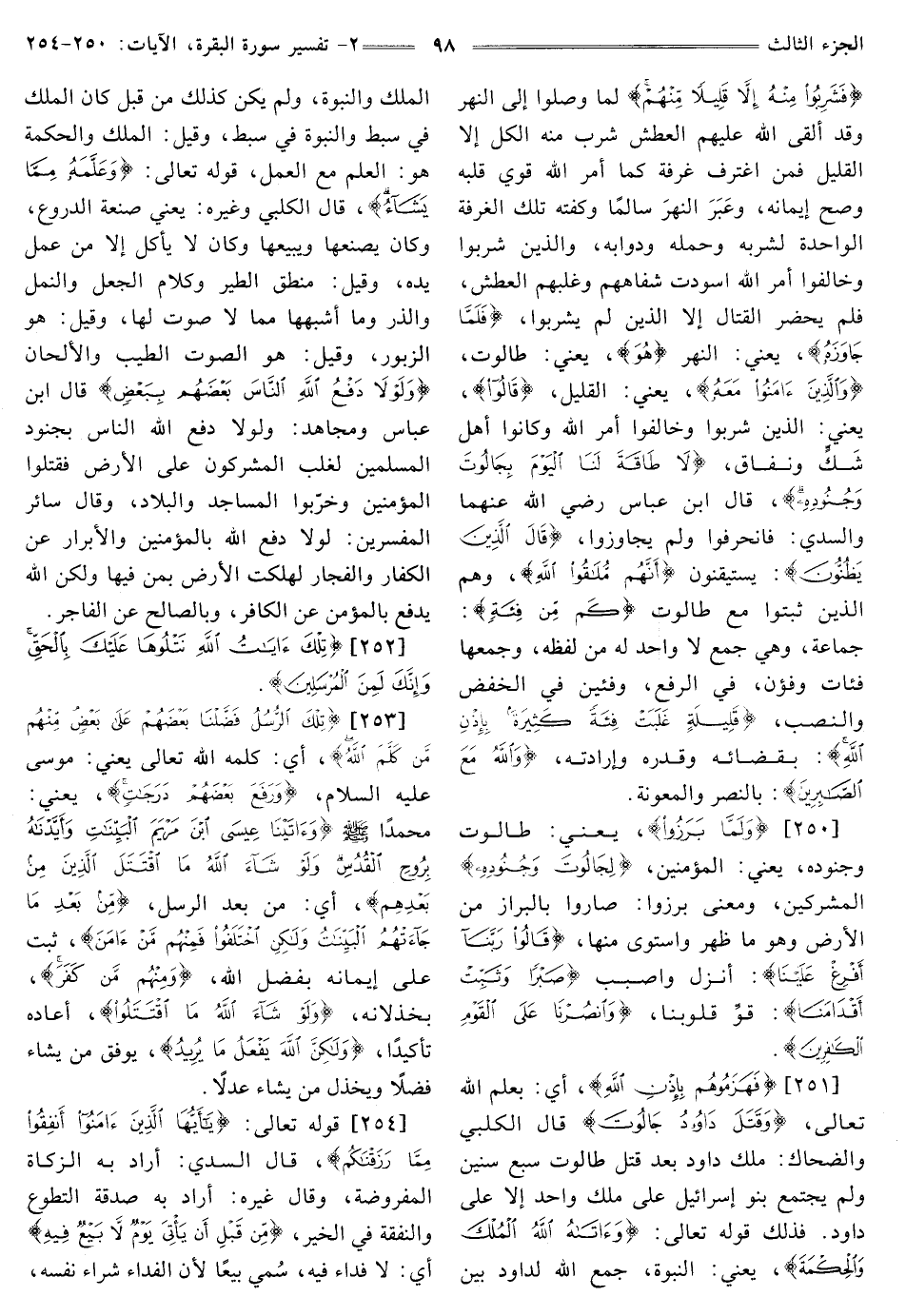[251] {فَهَزَمُوهُمْ بِإِذْنِ اللَّهِ} [البقرة: 251] أَيْ: بِعِلْمِ اللَّهِ تَعَالَى، {وَقَتَلَ دَاوُدُ جَالُوتَ} [البقرة: 251] قَالَ الْكَلْبِيُّ وَالضَّحَّاكُ: مَلَكَ دَاوُدُ بَعْدَ قَتْلِ طَالُوتَ سَبْعَ سِنِينَ وَلَمْ يَجْتَمِعْ بَنُو إِسْرَائِيلَ عَلَى مَلِكٍ وَاحِدٍ إِلَّا عَلَى دَاوُدَ. فَذَلِكَ قَوْلُهُ تَعَالَى: {وَآتَاهُ اللَّهُ الْمُلْكَ وَالْحِكْمَةَ} [البقرة: 251] يَعْنِي: النُّبُوَّةَ، جَمَعَ اللَّهُ لِدَاوُدَ بَيْنَ الْمُلْكِ وَالنُّبُوَّةِ، وَلَمْ يَكُنْ كذلك من قبل كَانَ الْمُلْكُ فِي سِبْطٍ وَالنُّبُوَّةُ فِي سِبْطٍ، وَقِيلَ: الْمُلْكُ وَالْحِكْمَةُ هُوَ: الْعِلْمُ مَعَ الْعَمَلِ، قَوْلُهُ تعالى: {وَعَلَّمَهُ مِمَّا يَشَاءُ} [البقرة: 251] قَالَ الْكَلْبِيُّ وَغَيْرُهُ: يَعْنِي صَنْعَةَ الدُّرُوعِ، وَكَانَ يَصْنَعُهَا وَيَبِيعُهَا وَكَانَ لَا يَأْكُلُ إِلَّا مِنْ عَمَلِ يَدِهِ، وَقِيلَ: مَنْطِقُ الطَّيْرِ وَكَلَامُ الجعل والنمل والذر وما أشبهها مما لا صوت لها، وَقِيلَ: هُوَ الزَّبُورُ، وَقِيلَ: هُوَ الصوت الطيب والألحان {وَلَوْلَا دَفْعُ اللَّهِ النَّاسَ بَعْضَهُمْ بِبَعْضٍ} [البقرة: 251] قَالَ ابْنُ عَبَّاسٍ وَمُجَاهِدٌ: وَلَوْلَا دفع الله الناس بِجُنُودِ الْمُسْلِمِينَ لَغَلَبَ الْمُشْرِكُونَ عَلَى الْأَرْضِ فَقَتَلُوا الْمُؤْمِنِينَ وَخَرَّبُوا الْمَسَاجِدَ وَالْبِلَادَ، وَقَالَ سَائِرُ الْمُفَسِّرِينَ: لَوْلَا دَفْعُ اللَّهِ بِالْمُؤْمِنِينَ وَالْأَبْرَارِ عَنِ الْكُفَّارِ وَالْفُجَّارِ لَهَلَكَتِ الْأَرْضُ بِمَنْ فِيهَا وَلَكِنَّ اللَّهَ يَدْفَعُ بِالْمُؤْمِنِ عَنِ الْكَافِرِ، وَبِالصَّالِحِ عَنِ الْفَاجِرِ.