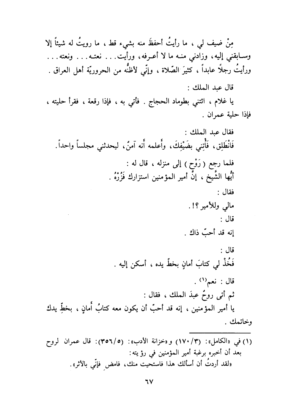 من ضيف لي مَا رَأَيْت أحفظ مِنْهُ بشئ قطّ مَا رويت لَهُ شَيْئا إِلَّا وسابقني هَذِه إِلَيْهِ وَزَادَنِي مِنْهُ مَا لَا أعرفهُ وَرَأَيْت نَعته نَعته ونعته وَرَأَيْت رجلا عابدا كثير الصَّلَاة وَإِنِّي لأظنه من الحرورية أهل الْعرَاق قَالَ عبد الْملك يَا غُلَام ائْتِنِي بطوماد سنة الْحجَّاج فَأتي بِهِ فَإِذا رقْعَة فَقَرَأَ حليته فَإِذا حلية عمرَان فَقَالَ عبد الْملك فَانْطَلق فأتني بضيفك وأعلمه أَنه آمن ليحدثني مَجْلِسا وَاحِدًا فَلَمَّا رَجَعَ روح إِلَى منزله قَالَ لَهُ أَيهَا الشَّيْخ إِن أَمِير الْمُؤمنِينَ استزارك فزره فَقَالَ مَالِي وللأمير قَالَ إِنَّه قد أحب ذَاك قَالَ فَخذ لي كتاب أَمَان بِخَط يَده أسكن إِلَيْهِ قَالَ نعم ثمَّ اتى روح عبد الْملك فَقَالَ يَا أَمِير الْمُؤمنِينَ إِنَّه قد أحب أَن يكون مَعَه كتاب أَمَان بِخَط يدك وخاتمك