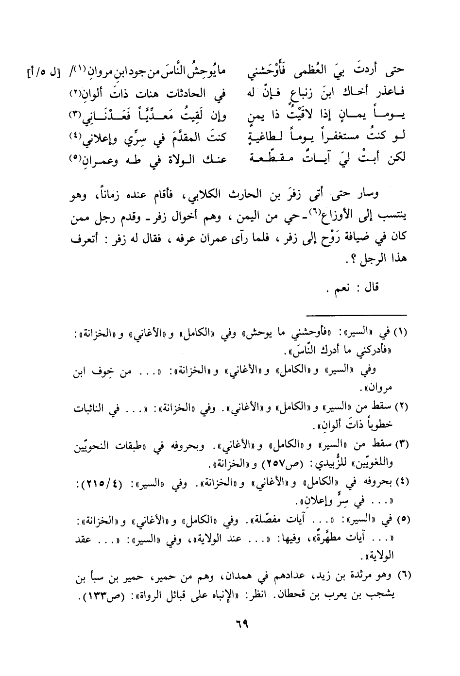 وَسَار حَتَّى أَتَى زفر بن الْحَارِث الْكلابِي فَأَقَامَ عِنْده زَمَانا وَهُوَ ينتسب إِلَى الأوزاع حَيّ من الْيمن وهم أخوال زفر وَقدم رجل مِمَّن كَانَ فِي ضِيَافَة روح إِلَى زفر فَلَمَّا رَأْي عمرَان عرفه فَقَالَ لَهُ زفر أتعرف هَذَا الرجل قَالَ نعم
