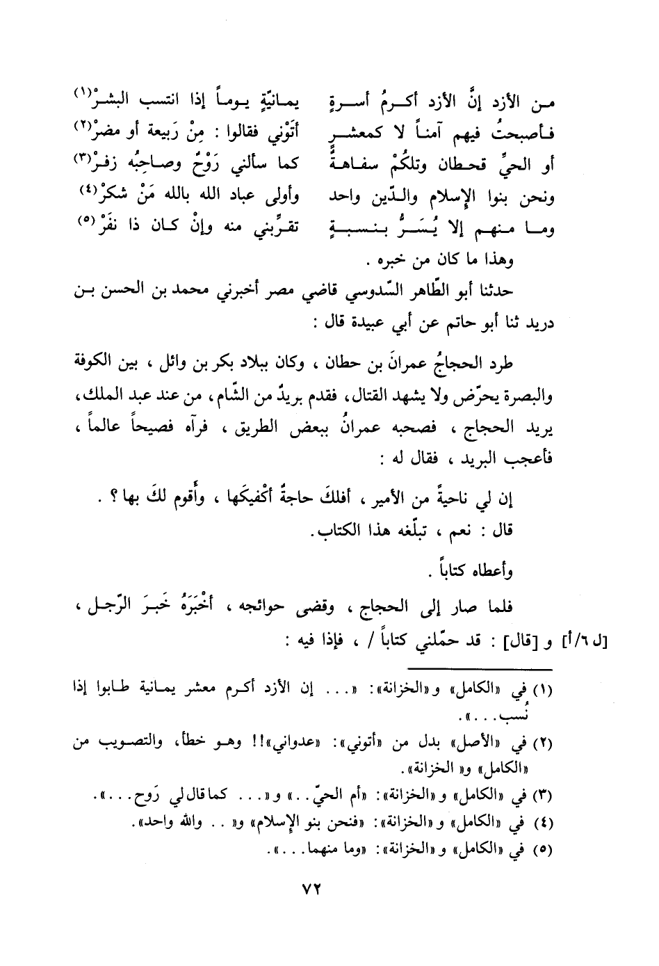 24 - حَدثنَا أَبُو طَاهِر السدُوسِي قَاضِي مصر أَخْبرنِي مُحَمَّد بن الْحسن بن دُرَيْد ثَنَا حَاتِم عَن أبي عُبَيْدَة قَالَ طرد الْحجَّاج عمرَان بن حطَّان وَكَانَ بِبِلَاد بكر بن وَائِل بَين الْكُوفَة وَالْبَصْرَة يحرض وَلَا يشْهد الْقِتَال فَقدم بريد من الشَّام من عِنْد عبد الْملك يُرِيد الْحجَّاج فصحبه عمرَان بِبَعْض الطَّرِيق فَرَآهُ فصيحا عَالما فأعجب الْبَرِيد فَقَالَ لَهُ إِن لي نَاحيَة من الْأَمِير أَفَلَك حَاجَة أكفيكها وأقوم لَك بهَا قَالَ نعم تبلغه هَذَا الْكتاب واعطاه كتابا فَلَمَّا صَار إِلَى الْحجَّاج وَقضى حَوَائِجه اخبره خبر الرجل وَقَالَ قد حَملَنِي كتاب فَإِذا فِيهِ