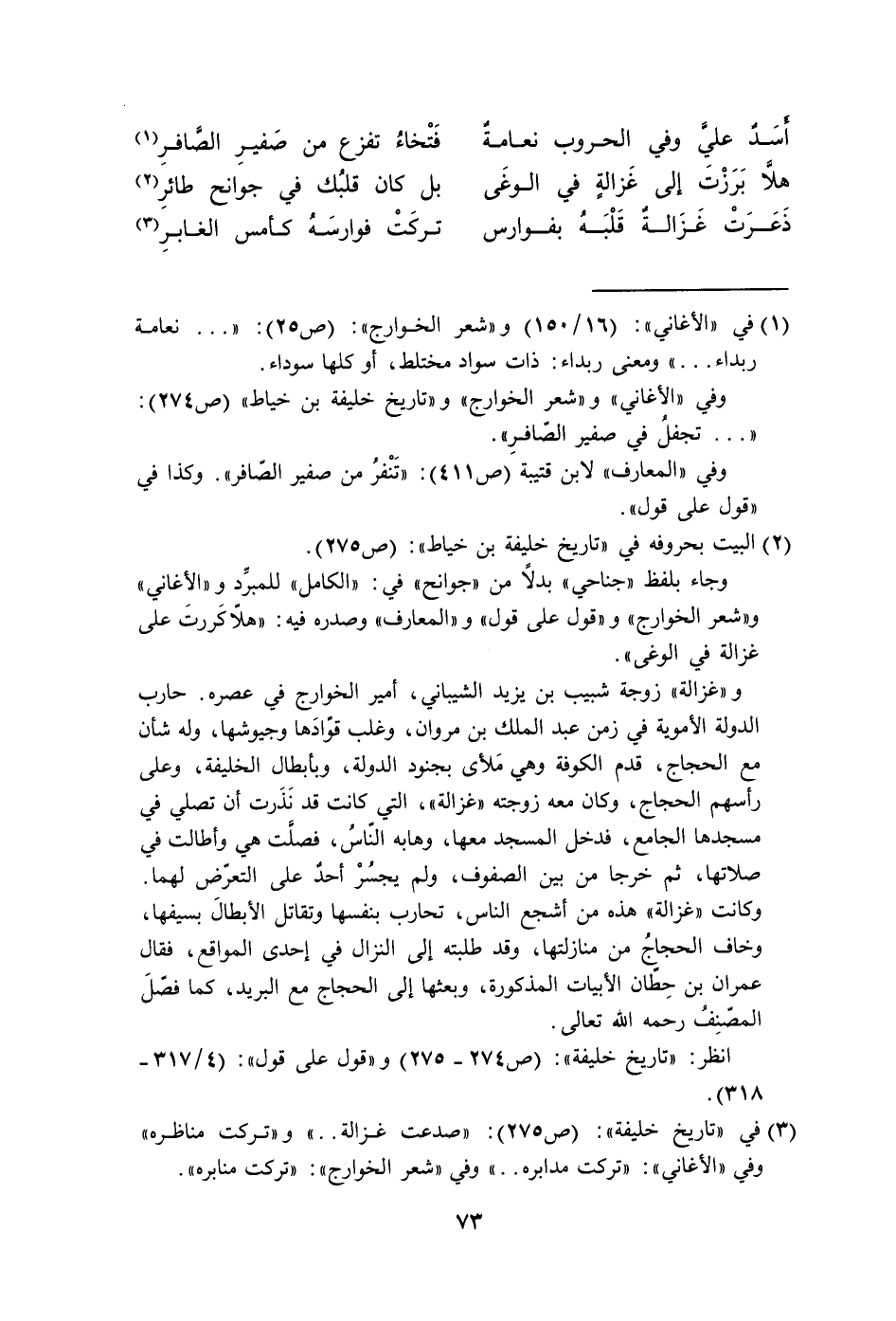 هلا برزت إِلَى غزالة فِي الوغى ... بل كَانَ قَلْبك فِي جوانح طَائِر
