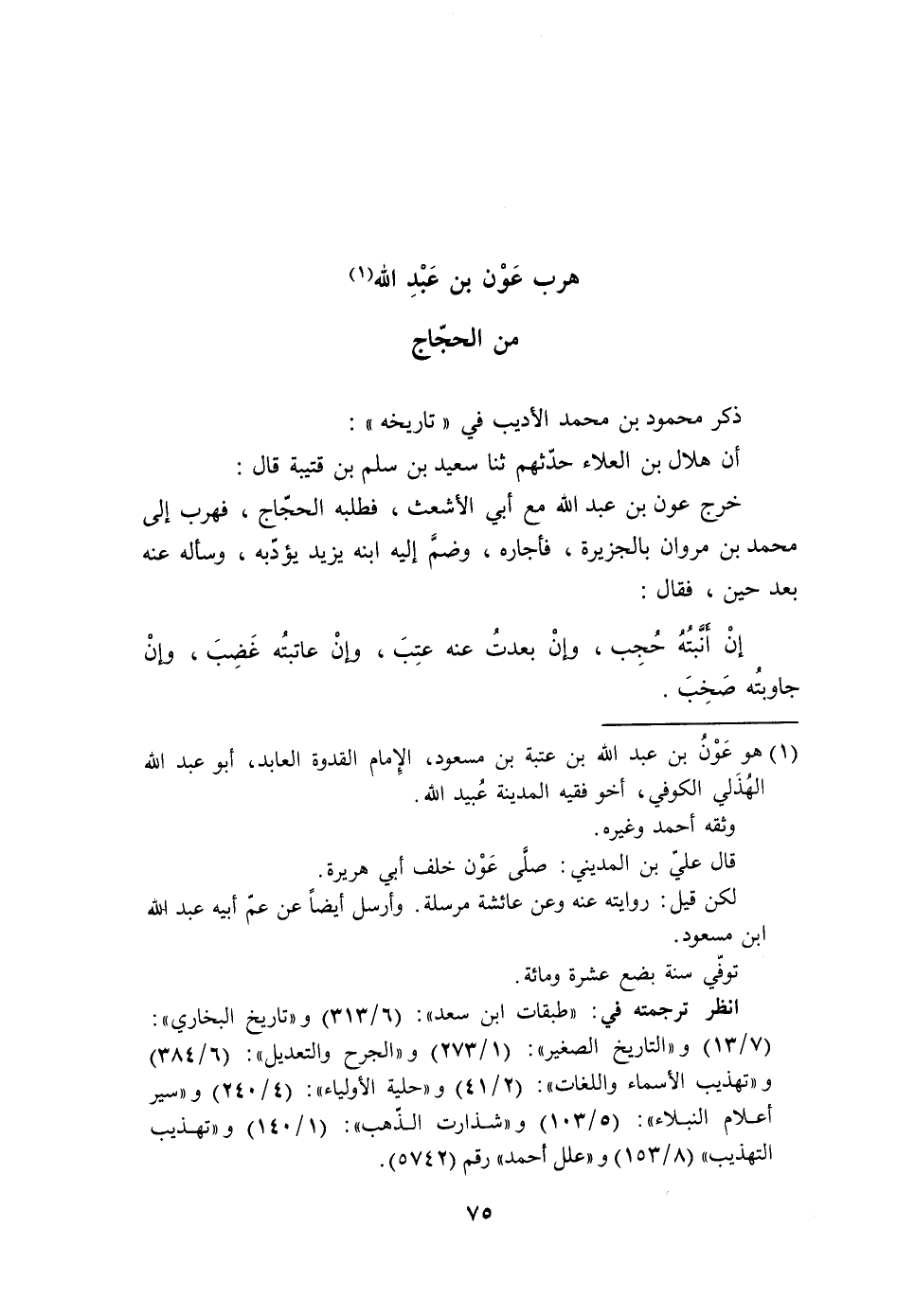 ذكر مَحْمُود بن مُحَمَّد الأديب فِي تَارِيخه أَن هِلَال بن الْعَلَاء حَدثهمْ ثَنَا سعيد بن سلم بن قُتَيْبَة قَالَ خرج عون بن عبد الله مَعَ أبي الأشعت فَطَلَبه الْحجَّاج فهرب إِلَى مُحَمَّد بن مَرْوَان بالجزيرة فأجاره وَضم إِلَيْهِ ابْنه يزِيد يؤدبه وَسَأَلَهُ عَنهُ بعد حِين فَقَالَ إِن أَنْبَتَهُ حجب وَإِن بَعدت عَنهُ عتب وَإِن عاتبته غضب وَإِن جاوبته صخب