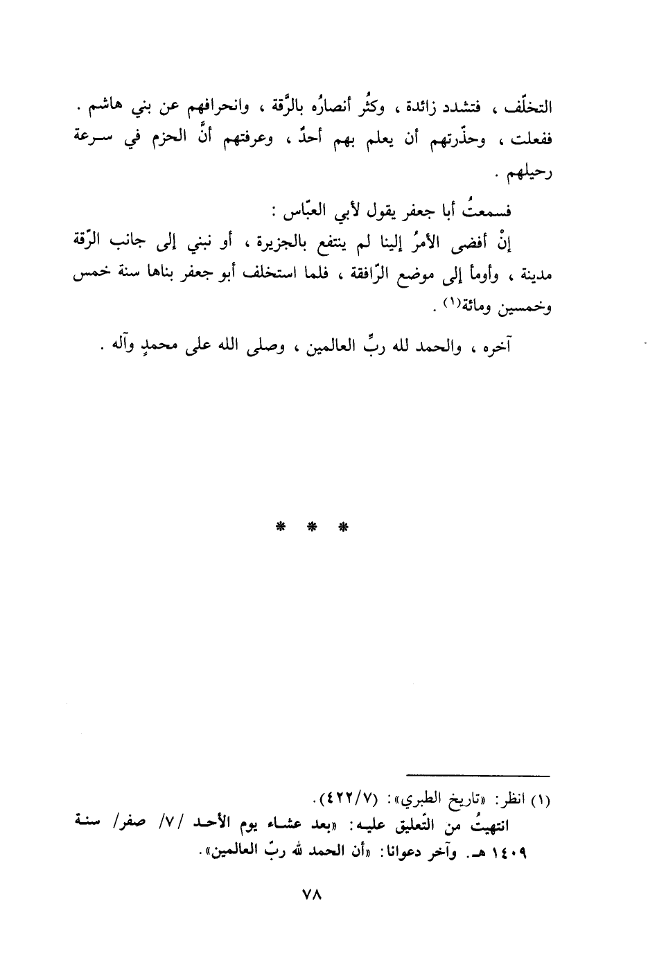 التَّخَلُّف فتشدد زَائِدَة وَكثر أنصاره بالرقة وانحرافهم عَن بني هَاشم فَفعلت وحذرتهم أَن يعلم بهم أحد وعرفتهم أَن الحزم فِي سرعَة رحيلهم فَسمِعت أَبَا جَعْفَر يَقُول لأبي الْعَبَّاس إِن أفْضى الْأَمر إِلَيْنَا لم ينْتَفع بالجزيرة أَو نَبْنِي إِلَى جَانب الرقة مَدِينَة وأوما إِلَى مَوضِع الرافقة فَلَمَّا اسْتخْلف أَبُو جَعْفَر بناها سنة خمس وَخمسين وَمِائَة