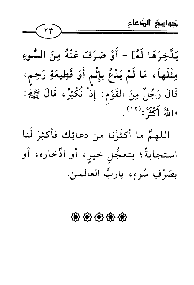 قال عليه الصَّلاةُ والسَّلامُ: «مَا عَلَى الأَرْضِ مُسْلِمٌ يَدْعُو اللهَ تَعَالَى بِدَعْوَةٍ إِلاَّ آتَاهُ اللهُ إِيَّاها -[إِمَّا أَنْ يُعَجِّلَهَا وَإمَّا أَنْ يَدَّخِرَهَا لَهُ]- أَوْ صَرَفَ عَنْهُ