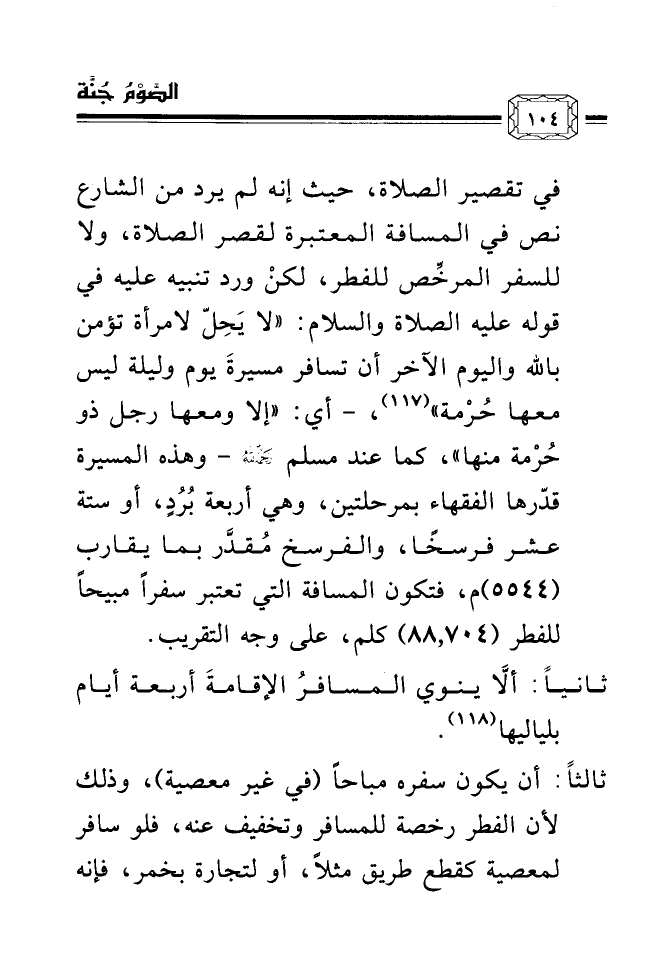 في تقصير الصلاة، حيث إنه لم يرد من الشارع نص في المسافة المعتبرة لقصر الصلاة، ولا للسفر المرخِّص للفطر، لكنْ ورد تنبيه عليه في قوله عليه الصلاة والسلام: «لا يَحِلّ لامرأة تؤمن بالله واليوم الآخر أن تسافر مسيرةَ يوم وليلة ليس معها حُرْمة» (¬117) ، - أي: «إلا ومعها رجل ذو حُرْمة منها» ، كما عند مسلم رحمه الله - وهذه المسيرة قدّرها الفقهاء بمرحلتين، وهي أربعة بُرُدٍ، أو ستة عشر فرسخًا، والفرسخ مُقدَّر بما يقارب (5544) م، فتكون المسافة التي تعتبر سفراً مبيحاً للفطر (88.704) كلم، على وجه التقريب.