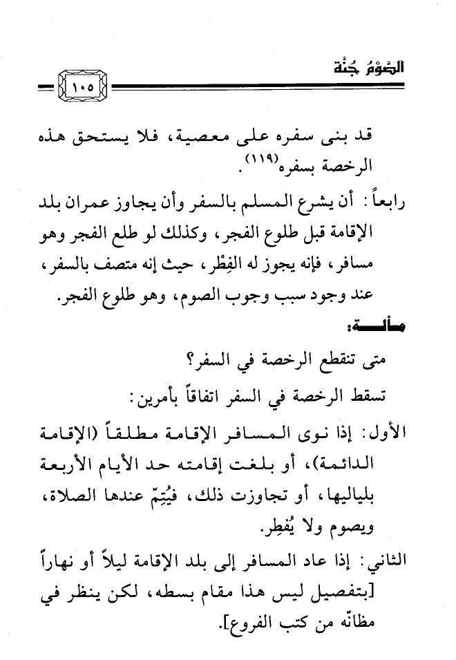 (¬119) هذا عند الجمهور، وأجاز الحنفية الفطر للمسافر ولو كان عاصياً بسفره، عملاً بإطلاق النصوص المرخِّصة، ولأن الرخصة تتعلق بالسفر لا بالغرض منه. انظر: المرجع السابق بالعزو نفسه. ... هذا، وقد عنون الإمام مسلم - بعظيم فقهه رحمه الله - باباً في كتاب الصيام بقوله: (باب: جواز الصوم والفطر في شهر رمضانَ للمسافر في غير معصية، إذا كان سفره مرحلتين فأكثر) . اهـ. والمرحلة: برُدان، والبريد العربي أربعة فراسخ، والفرسخ ثلاثة أميال، والميل يقارب (1848م) ، فيتحصل بذلك أن الفرسخ = (5544م) ، والبريد = (22176م) ، فتكون المرحلة تقارب (44352م) ، والمرحلتان، وهي مسافة قصر الصلاة، وإباحة الفطر = (88704م) أي 88.704 كلم. انظر: الفقه الإسلامي وأدلته. د/وهبة الزحيلي (1/142) .