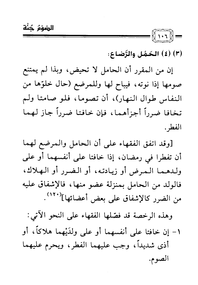 إن من المقرر أن الحامل لا تحيض، وبذا لم يمتنع صومها إذا نوته، فيباح لها وللمرضع (حال خلوّها من النفاس طوال النهار) ، أن تصوما، فلو صامتا ولم تخافا ضرراً أجزأهما، فإن خافتا ضرراً جاز لهما الفطر.