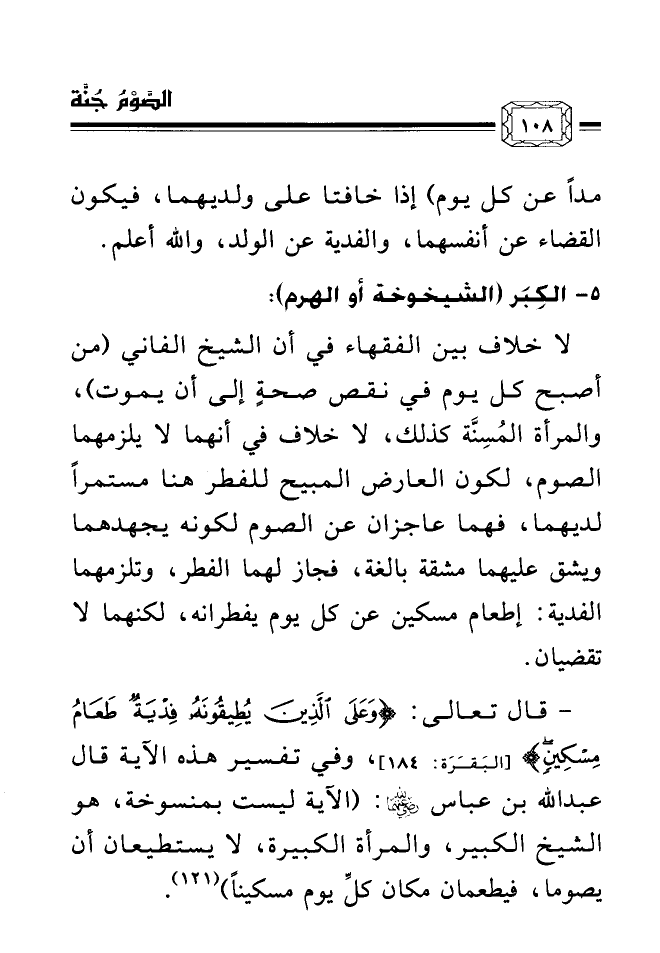- قال تعالى: {وَعَلَى الَّذِينَ يُطِيقُونَهُ فِدْيَةٌ طَعَامُ مِسْكِينٍ} [البَقَرَة: 184] ، وفي تفسير هذه الآية قال عبد الله بن عباس رضي الله عنهما: (الآية ليست بمنسوخة، هو الشيخ الكبير، والمرأة الكبيرة، لا يستطيعان أن يصوما، فيطعمان مكان كلِّ يوم مسكيناً) (¬121) .