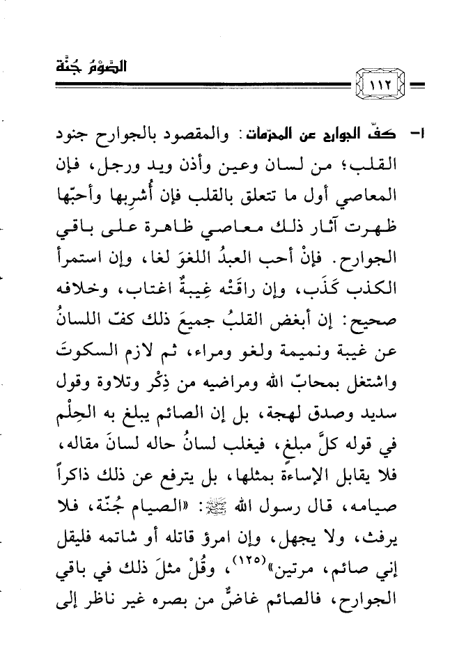 1- ... كفّ الجوارح عن المحرّمات: والمقصود بالجوارح جنود القلب؛ من لسان وعين وأذن ويد ورجل، فإن المعاصي أول ما تتعلق بالقلب فإن أُشرِبها وأحبّها ظهرت آثار ذلك معاصي ظاهرة على باقي الجوارح. فإنْ أحب العبدُ اللغوَ لغا، وإن استمرأ الكذب كَذَب، وإن راقَتْه غِيبةٌ اغتاب، وخلافه صحيح: إن أبغض القلبُ جميعَ ذلك كفّ اللسانُ عن غيبة ونميمة ولغو ومراء، ثم لازم السكوتَ واشتغل بمحابّ الله ومراضيه من ذِكْر وتلاوة وقول سديد وصدق لهجة، بل إن الصائم يبلغ به الحِلْم في قوله كلَّ مبلغٍ، فيغلب لسانُ حاله لسانَ مقاله، فلا يقابل الإساءة بمثلها، بل يترفع عن ذلك ذاكراً صيامه، قال رسول الله صلى الله عليه وسلم: «الصيام جُنّة، فلا يرفث، ولا يجهل، وإن امرؤ قاتله أو شاتمه فليقل إني صائم، مرتين» (¬125) ، وقُلْ مثلَ ذلك في باقي الجوارح، فالصائم غاضٌّ من بصره غير ناظر إلى
