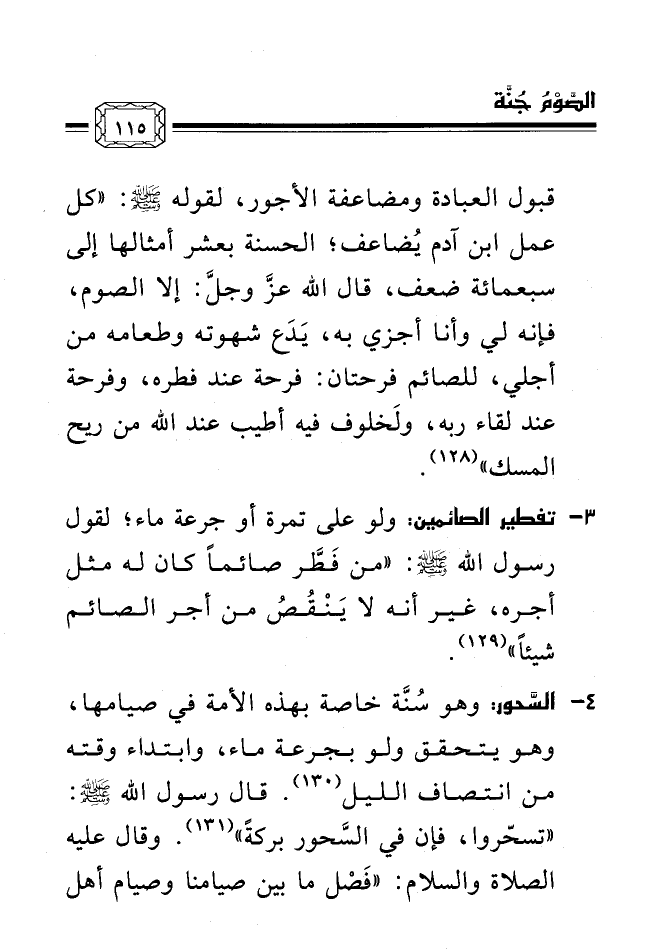 4- ... السَّحور: وهو سُنَّة خاصة بهذه الأمة في صيامها، وهو يتحقق ولو بجرعة ماء، وابتداء وقته من انتصاف الليل (¬130) . قال رسول الله صلى الله عليه وسلم: «تسحّروا، فإن في السَّحور بركةً» (¬131) . وقال عليه الصلاة والسلام: «فَصْل ما بين صيامنا وصيام أهل