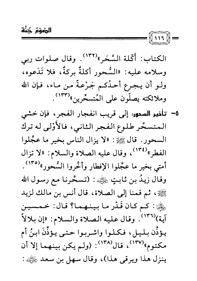(¬136) متفق عليه من حديث زيد بن ثابت رضي الله عنه: أخرجه البخاري؛ كتاب: الصوم، باب: تأخير السحور، برقم (1921) ، ومسلم؛ كتاب: الصيام، باب: فضل السحور، برقم (1097) . واللفظ لمسلم رحمه الله.