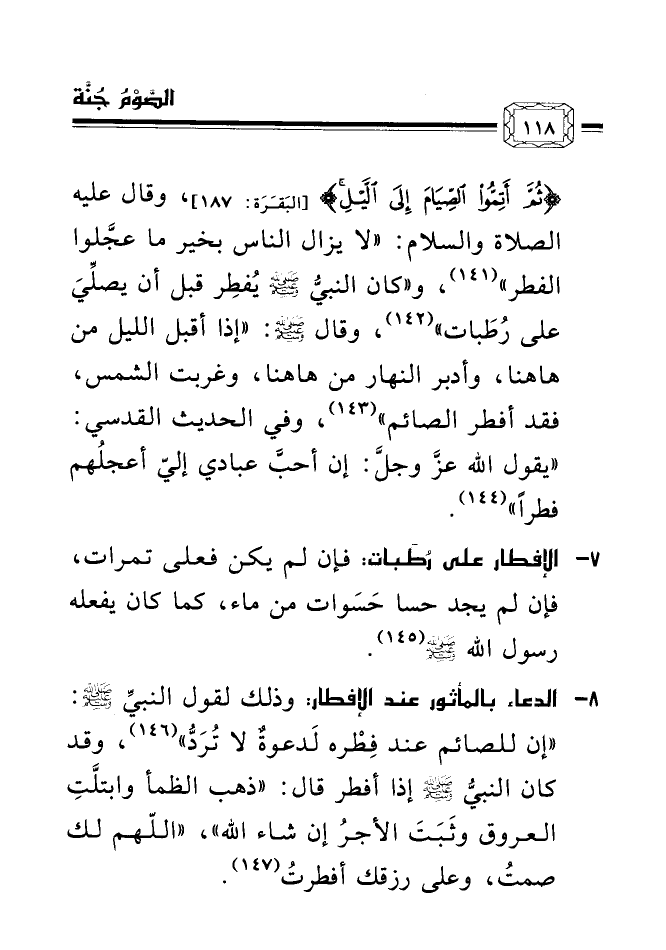 {ثُمَّ أَتِمُّوا الصِّيَامَ إِلَى اللَّيْلِ} [البَقَرَة: 187] ، وقال عليه الصلاة والسلام: «لا يزال الناس بخير ما عجَّلوا الفطر» (¬141) ، و «كان النبيُّ صلى الله عليه وسلم يُفطِر قبل أن يصلِّيَ على رُطَبات» (¬142) ، وقال صلى الله عليه وسلم: «إذا أقبل الليل من هاهنا، وأدبر النهار من هاهنا، وغربت الشمس، فقد أفطر الصائم» (¬143) ، وفي الحديث القدسي: «يقول الله عزَّ وجلَّ: إن أحبَّ عبادي إليّ أعجلُهم فطراً» (¬144) .