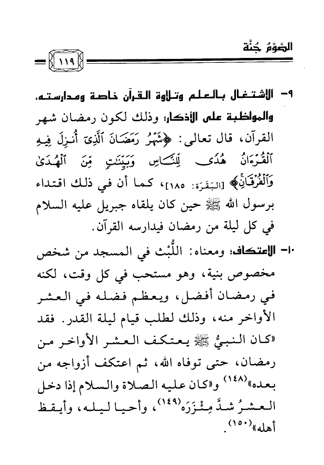 9- ... الاشتغال بالعلم وتلاوة القرآن خاصة ومدارسته، والمواظبة على الأذكار؛ وذلك لكون رمضان شهر القرآن، قال تعالى: {شَهْرُ رَمَضَانَ الَّذِي أُنْزِلَ فِيهِ الْقُرْآنُ هُدىً لِلنَّاسِ وَبَيِّنَاتٍ مِنَ الْهُدَى وَالْفُرْقَانِ} [البَقَرَة: 185] ، كما أن في ذلك اقتداء برسول الله صلى الله عليه وسلم حين كان يلقاه جبريل عليه السلام في كل ليلة من رمضان فيدارسه القرآن.