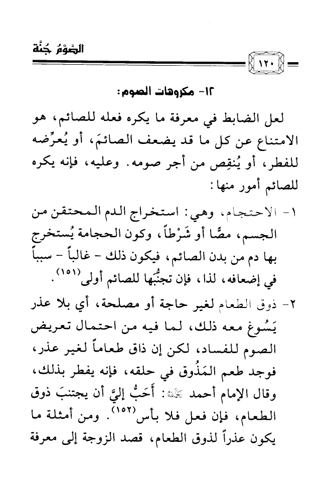 (¬151) تقدم ذكر الحجامة، في مبحث: ما لا يفسد الصوم أصلاً ص (129) ، فراجعه - إن شئت -.