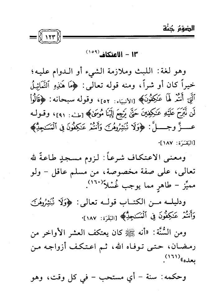 (¬159) قد سبق ذكر للاعتكاف في ختام جملة المندوبات ص (158) ، لكني أختصّه هنا - لأهميته - بمزيد تفصيلٍ لأحكامه.