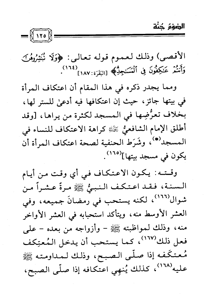 (¬164) قال ابن حجر رحمه الله: (ووجه الدلالة من الآية: أنه لو صحّ - أي: الاعتكاف - في غير المسجد لم يختص تحريم المباشرة به، لأن الجماع منافٍ للاعتكاف بالإجماع، فعُلِم من ذِكْر المساجد أن الاعتكاف لا يكون إلا فيها) . اهـ. انظر الفتح [4/319] . هذا، وقد عنون الإمام البخاري -بما فَقِه من الآية - بقوله: (باب الاعتكاف في العشر الأواخر، والاعتكاف في المساجد كلِّها لقوله تعالى: [البَقَرَة: 187] {وَلاَ تُبَاشِرُوهُنَّ وَأَنْتُمْ عَاكِفُونَ فِي الْمَسَاجِدِ تِلْكَ حُدُودُ اللَّهِ فَلاَ تَقْرَبُوهَا كَذَلِكَ يُبَيِّنُ اللَّهُ آيَاتِهِ لِلنَّاسِ لَعَلَّهُمْ يَتَّقُونَ} .