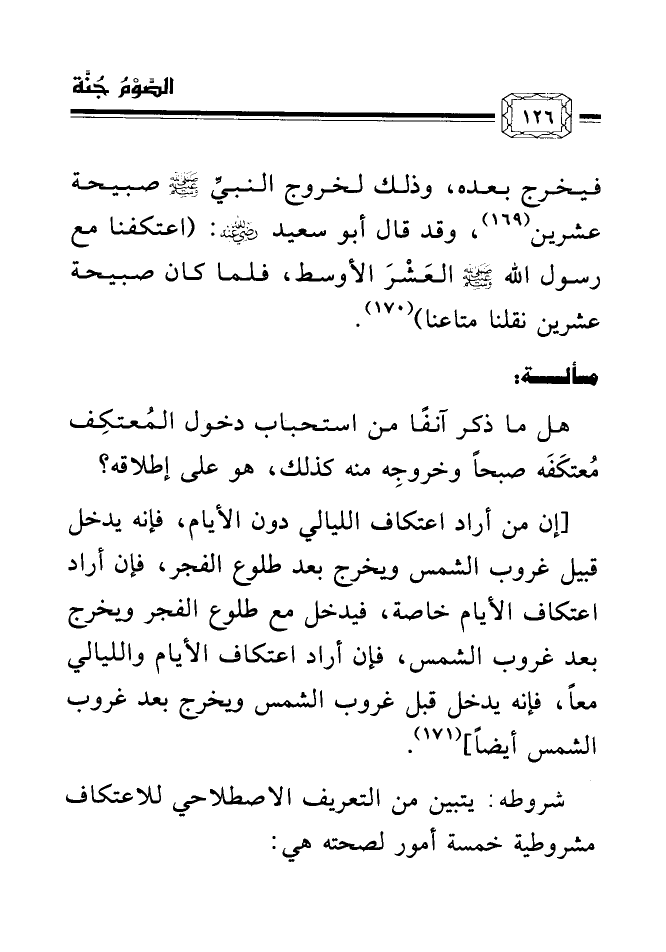 (¬171) الكلام لابن حجر رحمه الله. انظر: الفتح (4/332) . ... هذا، وإن ما أرشدت إليه السنَّة المطهَّرة من دخول المُعتكِف مُعتكفَه صبحاً وخروجه منه كذلك، يَصْدُق فيه - بحمد لله - إدراكُ كلِّ معتكف لوقت اعتكافه، فإن أراد أياماً أدرك ذلك بدخوله بعد الصبح، وإن أراد ليالي أدركها بخروجه بعد الصبح، كذلك لو أراد أياماً وليالي، فإن دخوله صبحاً وخروجه صبحاً، يجعله مستوفياً لما أراد، مقتدياً بخير العباد، عاملاً بسُنَّته صلى الله عليه وسلم.