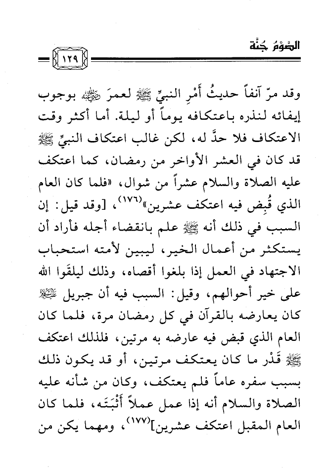 وقد مرّ آنفاً حديثُ أَمْرِ النبيِّ صلى الله عليه وسلم لعمرَ رضي الله عنه بوجوب إيفائه لنذره باعتكافه يوماً أو ليلة. أما أكثر وقت الاعتكاف فلا حدَّ له، لكن غالب اعتكاف النبيِّ صلى الله عليه وسلم قد كان في العشر الأواخر من رمضان، كما اعتكف عليه الصلاة والسلام عشراً من شوال، «فلما كان العام الذي قُبِض فيه اعتكف عشرين» (¬176) ، [وقد قيل: إن السبب في ذلك أنه صلى الله عليه وسلم علم بانقضاء أجله فأراد أن يستكثر من أعمال الخير، ليبين لأمته استحباب الاجتهاد في العمل إذا بلغوا أقصاه، وذلك ليلقَوا الله على خير أحوالهم، وقيل: السبب فيه أن جبريل _ج كان يعارضه بالقرآن في كل رمضان مرة، فلما كان العام الذي قبض فيه عارضه به مرتين، فلذلك اعتكف صلى الله عليه وسلم قَدْر ما كان يعتكف مرتين، أو قد يكون ذلك بسبب سفره عاماً فلم يعتكف، وكان من شأنه عليه الصلاة والسلام أنه إذا عمل عملاً أَثْبَتَه، فلما كان العام المقبل اعتكف عشرين] (¬177) ، ومهما يكن من
