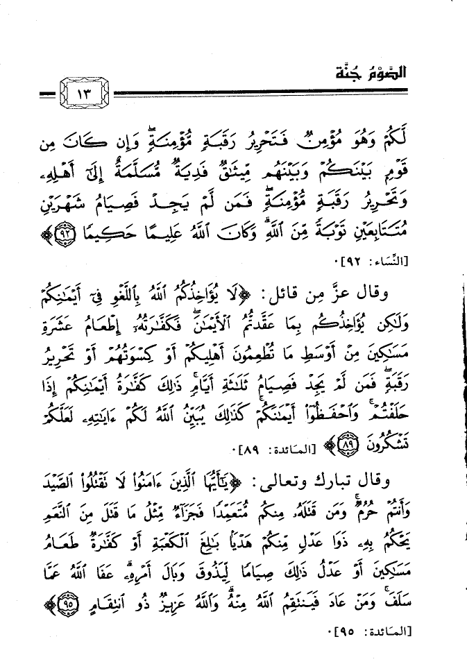 وقال عزَّ مِن قائل: {لاَ يُؤَاخِذُكُمُ اللَّهُ بِاللَّغْوِ فِي أَيْمَانِكُمْ وَلَكِنْ يُؤَاخِذُكُمْ بِمَا عَقَّدْتُّمُ الأَيْمَانَ فَكَفَّارَتُهُ إِطْعَامُ عَشَرَةِ مَسَاكِينَ مِنْ أَوْسَطِ مَا تُطْعِمُونَ أَهْلِيكُمْ أَوْ كِسْوَتُهُمْ أَوْ تَحْرِيرُ رَقَبَةٍ فَمَنْ لَمْ يَجِدْ فَصِيامُ ثَلاَثَةِ أَيَّامٍ ذَلِكَ كَفَّارَةُ أَيْمَانِكُمْ إِذَا حَلَفْتُمْ وَاحْفَظُوا أَيْمَانَكُمْ كَذَلِكَ يُبَيِّنُ اللَّهُ لَكُمْ آيَاتِهِ لَعَلَّكُمْ تَشْكُرُونَ *} . [المَائدة: 89]