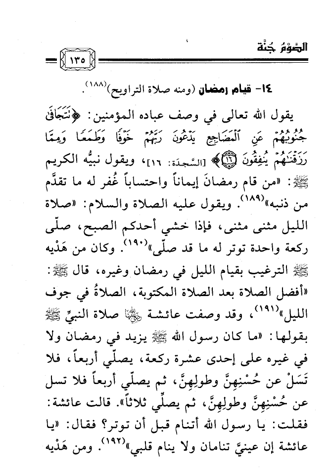14- قيام رمضان (ومنه صلاة التراويح) (¬188) .