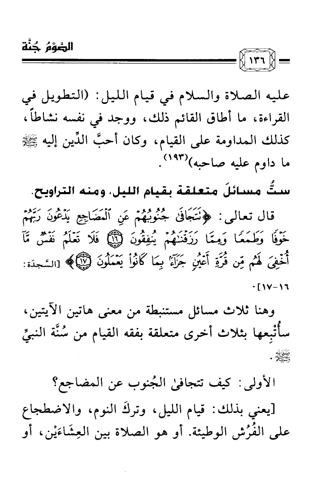 ستُّ مسائلَ متعلقة بقيام الليل، ومنه التراويح.