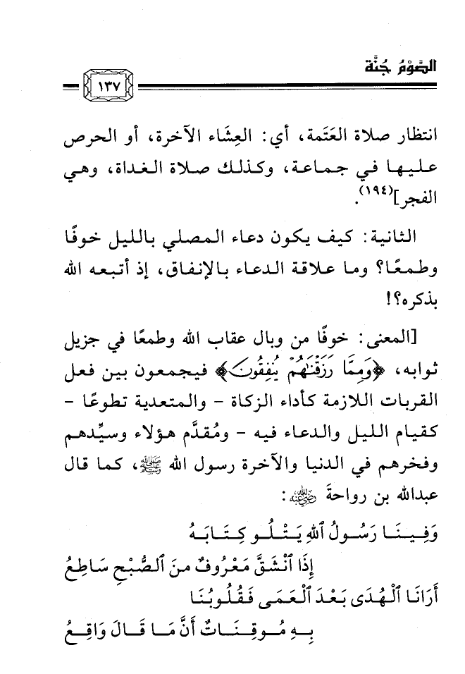 [المعنى: خوفًا من وبال عقاب الله وطمعًا في جزيل ثوابه، {وَمِمَّا رَزَقْنَاهُمْ يُنْفِقُونَ} فيجمعون بين فعل القربات اللازمة كأداء الزكاة - والمتعدية تطوعًا - كقيام الليل والدعاء فيه - ومُقدَّم هؤلاء وسيِّدهم وفخرهم في الدنيا والآخرة رسول الله صلى الله عليه وسلم، كما قال عبد الله بن رواحةَ رضي الله عنه: