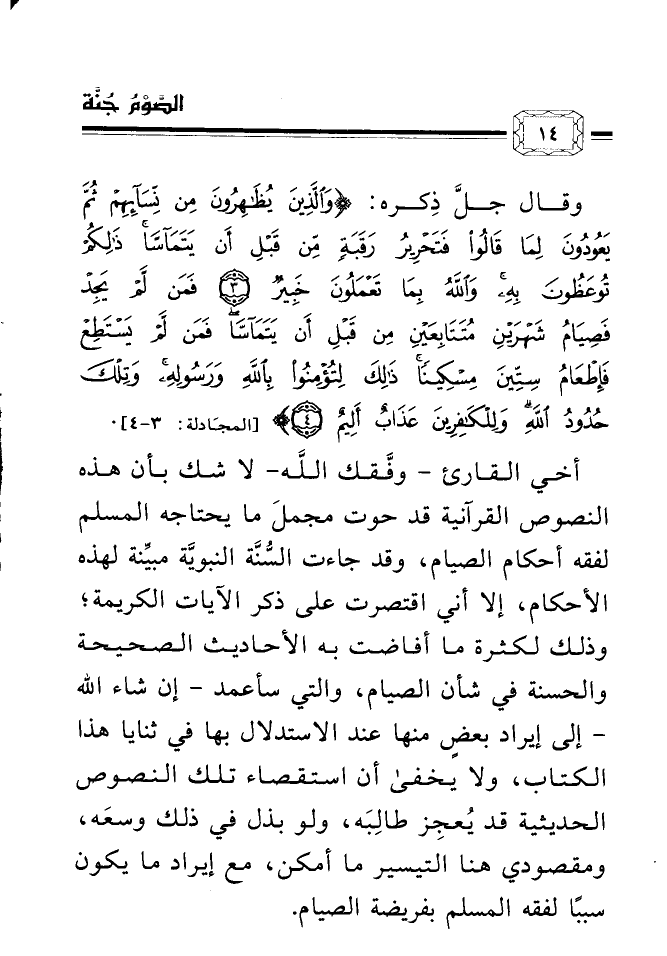 وقال جلَّ ذِكره: {وَالَّذِينَ يُظَاهِرُونَ مِنْ نِسَائِهِمْ ثُمَّ يَعُودُونَ لِمَا قَالُوا فَتَحْرِيرُ رَقَبَةٍ مِنْ قَبْلِ أَنْ يَتَمَآسَّا ذَلِكُمْ تُوعَظُونَ بِهِ وَاللَّهُ بِمَا تَعْمَلُونَ خَبِيرٌ *فَمَنْ لَمْ يَجِدْ فَصِيَامُ شَهْرَيْنِ مُتَتَابِعَيْنِ مِنْ قَبْلِ أَنْ يَتَمَآسَّا فَمَنْ لَمْ يَسْتَطِعْ فَإِطْعَامُ سِتِّينَ مِسْكِيناً ذَلِكَ لِتُؤْمِنُوا بِاللَّهِ وَرَسُولِهِ وَتِلْكَ حُدُودُ اللَّهِ وَلِلْكَافِرِينَ عَذَابٌ أَلِيمٌ *} . [المجَادلة: 3-4]
