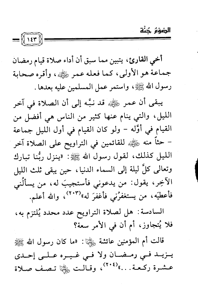 يبقى أن عمر رضي الله عنه قد نبَّه إلى أن الصلاة في آخر الليل، والتي ينام عنها كثير من الناس هي أفضل من القيام في أوَّله - ولو كان القيام في أول الليل جماعة - حثاً منه رضي الله عنه للقائمين في التراويح على الصلاة آخر الليل كذلك، لقول رسول الله صلى الله عليه وسلم: «ينزل ربُّنا تبارك وتعالى كلَّ ليلة إلى السماء الدنيا، حين يبقى ثلث الليل الآخِر، يقول: من يدعوني فأستجيبَ له، من يسألُني فأعطيَه، من يستغفرُني فأغفرَ له» (¬203) ، والله أعلم.