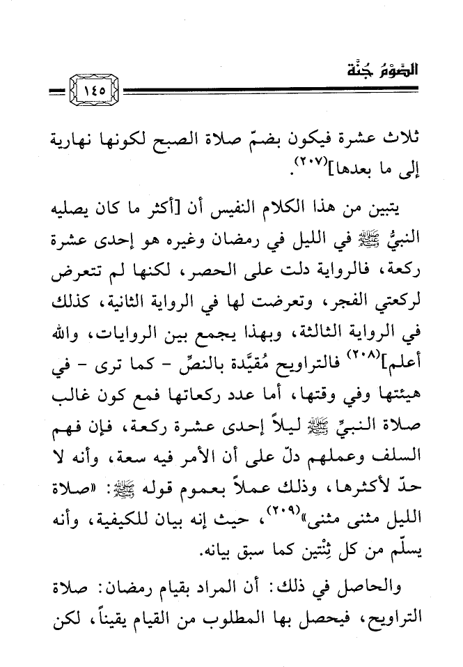 يتبين من هذا الكلام النفيس أن [أكثر ما كان يصليه النبيُّ صلى الله عليه وسلم في الليل في رمضان وغيره هو إحدى عشرة ركعة، فالرواية دلت على الحصر، لكنها لم تتعرض لركعتي الفجر، وتعرضت لها في الرواية الثانية، كذلك في الرواية الثالثة، وبهذا يجمع بين الروايات، والله أعلم] (¬208) فالتراويح مُقيَّدة بالنصِّ - كما ترى - في هيئتها وفي وقتها، أما عدد ركعاتها فمع كون غالب صلاة النبيِّ صلى الله عليه وسلم ليلاً إحدى عشرة ركعة، فإن فهم السلف وعملهم دلّ على أن الأمر فيه سعة، وأنه لا حدّ لأكثرها، وذلك عملاً بعموم قوله صلى الله عليه وسلم: «صلاة الليل مثنى مثنى» (¬209) ، حيث إنه بيان للكيفية، وأنه يسلّم من كل ثِنْتين كما سبق بيانه.