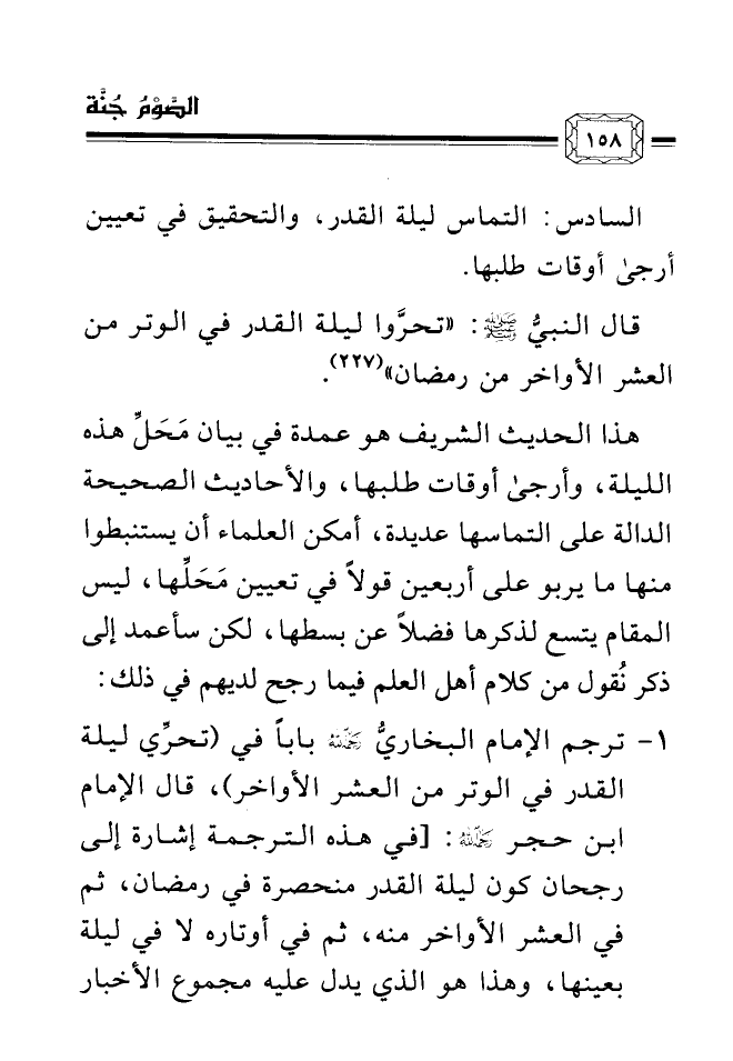1- ... ترجم الإمام البخاريُّ رحمه الله باباً في (تحرِّي ليلة القدر في الوتر من العشر الأواخر) ، قال الإمام ابن حجر رحمه الله: [في هذه الترجمة إشارة إلى رجحان كون ليلة القدر منحصرة في رمضان، ثم في العشر الأواخر منه، ثم في أوتاره لا في ليلة بعينها، وهذا هو الذي يدل عليه مجموع الأخبار