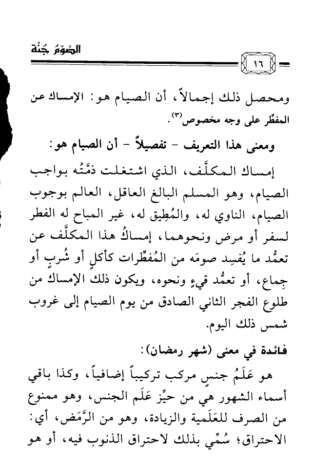 إمساك المكلَّف، الذي اشتغلت ذمَّتُه بواجب الصيام، وهو المسلم البالغ العاقل، العالم بوجوب الصيام، الناوي له، والمُطِيق له، غير المباح له الفطر لسفر أو مرض ونحوهما، إمساكُ هذا المكلَّف عن تعمُّد ما يُفسِد صومَه من المُفطِّرات كأكلٍ أو شُربٍ أو جِماع، أو تعمُّد قيءٍ ونحوه، ويكون ذلك الإمساك من طلوع الفجر الثاني الصادق من يوم الصيام إلى غروب شمس ذلك اليوم.