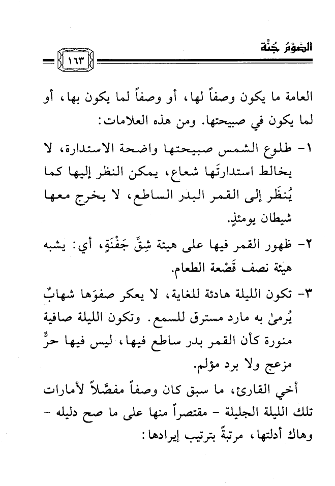 3- ... تكون الليلة هادئة للغاية، لا يعكر صفوَها شهابٌ يُرمى به مارد مسترق للسمع. وتكون الليلة صافية منورة كأن القمر بدر ساطع فيها، ليس فيها حرٌّ مزعج ولا برد مؤلم.