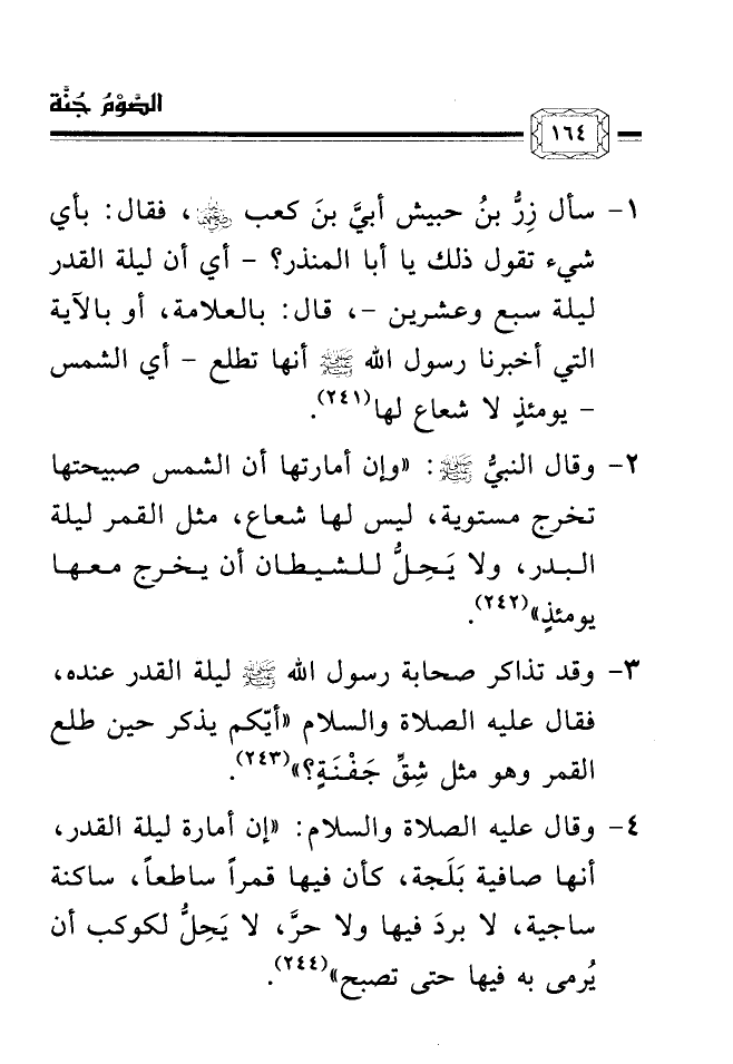 1- ... سأل زِرُّ بنُ حبيش أبيَّ بنَ كعب رضي الله عنهما، فقال: بأي شيء تقول ذلك يا أبا المنذر؟ - أي أن ليلة القدر ليلة سبع وعشرين -، قال: بالعلامة، أو بالآية التي أخبرنا رسول الله صلى الله عليه وسلم أنها تطلع - أي الشمس - يومئذٍ لا شعاع لها (¬241) .