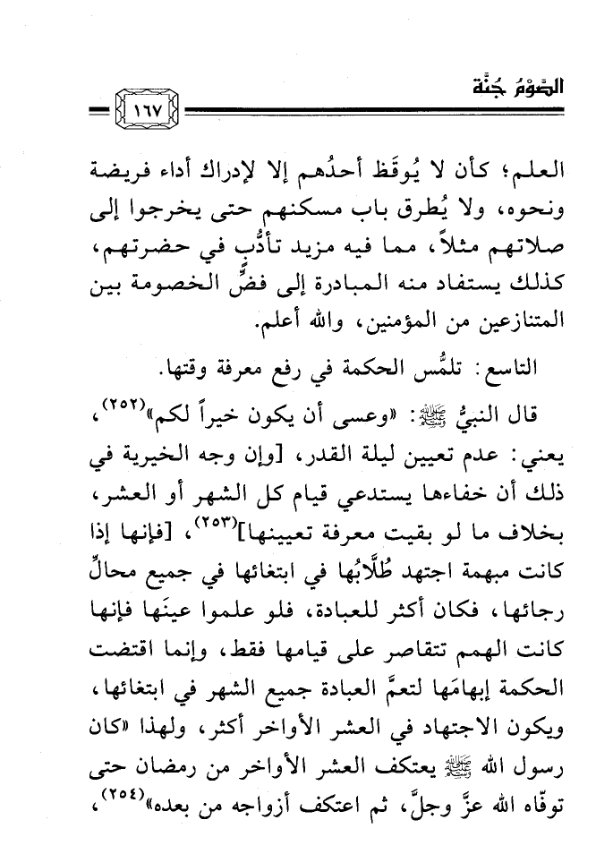 قال النبيُّ صلى الله عليه وسلم: «وعسى أن يكون خيراً لكم» (¬252) ، يعني: عدم تعيين ليلة القدر، [وإن وجه الخيرية في ذلك أن خفاءها يستدعي قيام كل الشهر أو العشر، بخلاف ما لو بقيت معرفة تعيينها] (¬253) ، [فإنها إذا كانت مبهمة اجتهد طُلاَّبُها في ابتغائها في جميع محالِّ رجائها، فكان أكثر للعبادة، فلو علموا عينَها فإنها كانت الهمم تتقاصر على قيامها فقط، وإنما اقتضت الحكمة إبهامَها لتعمَّ العبادة جميع الشهر في ابتغائها، ويكون الاجتهاد في العشر الأواخر أكثر، ولهذا «كان رسول الله صلى الله عليه وسلم يعتكف العشر الأواخر من رمضان حتى توفّاه الله عزَّ وجلَّ، ثم اعتكف أزواجه من بعده» (¬254) ،