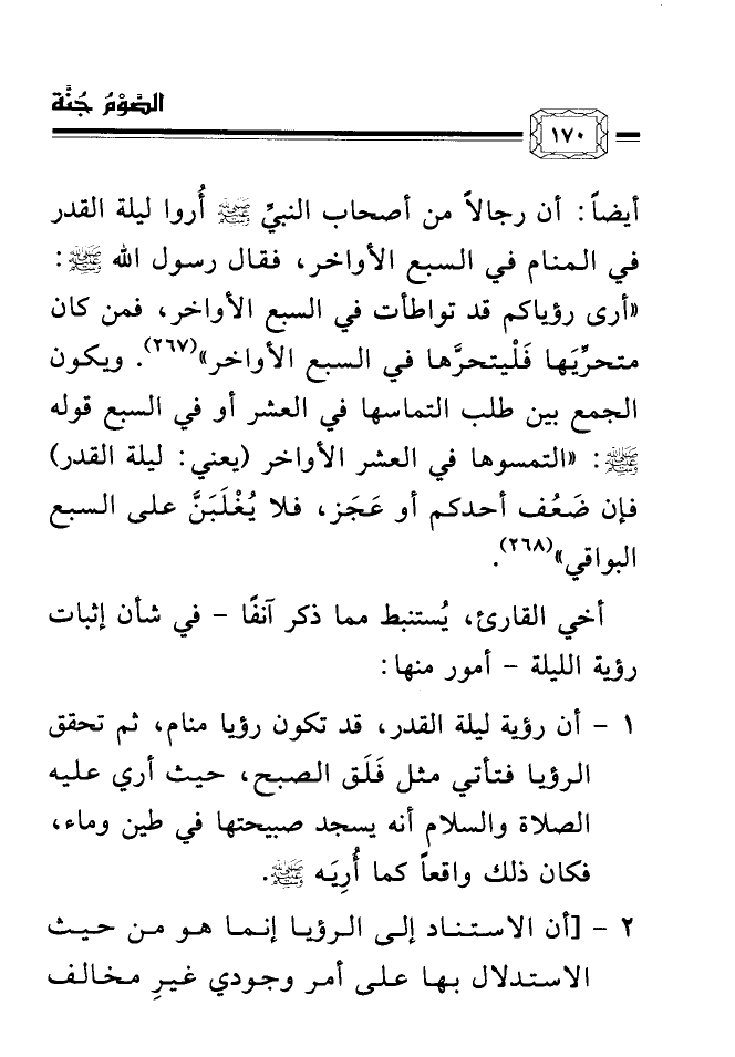 (¬267) متفق عليه؛ من حديث ابن عمر رضي الله عنهما: أخرجه البخاري؛ كتاب: فضل ليلة القدر، باب: التماس ليلة القدر في السبع الأواخر، برقم (2015) ، ومسلم؛ كتاب: الصيام، باب: فضل ليلة القدر، برقم (1165) .