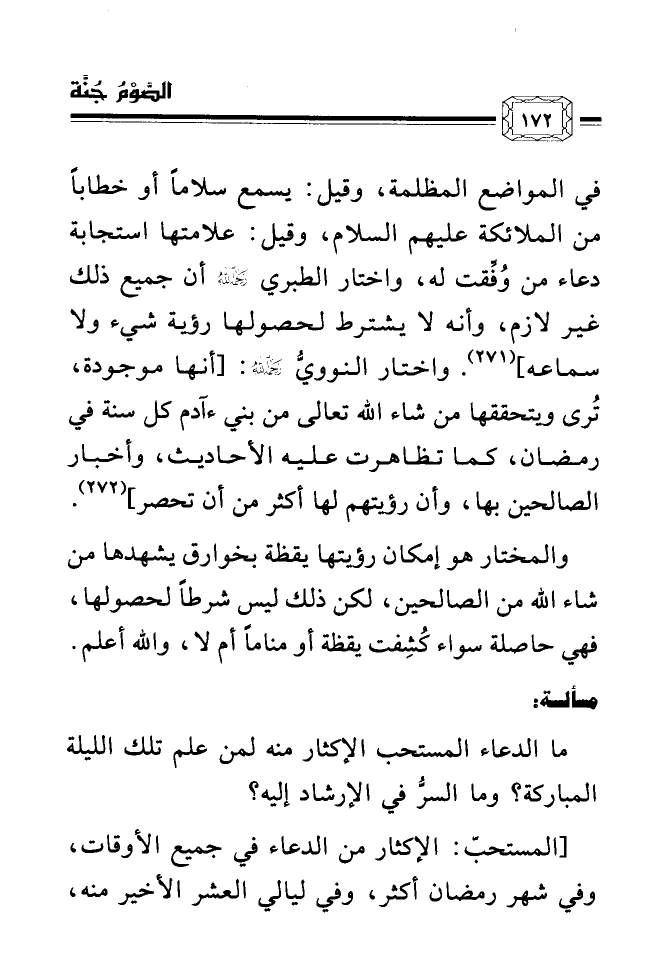 في المواضع المظلمة، وقيل: يسمع سلاماً أو خطاباً من الملائكة عليهم السلام، وقيل: علامتها استجابة دعاء من وُفِّقت له، واختار الطبري رحمه الله أن جميع ذلك غير لازم، وأنه لا يشترط لحصولها رؤية شيء ولا سماعه] (¬271) . واختار النوويُّ رحمه الله: [أنها موجودة، تُرى ويتحققها من شاء الله تعالى من بني ءآدم كل سنة في رمضان، كما تظاهرت عليه الأحاديث، وأخبار الصالحين بها، وأن رؤيتهم لها أكثر من أن تحصر] (¬272) .