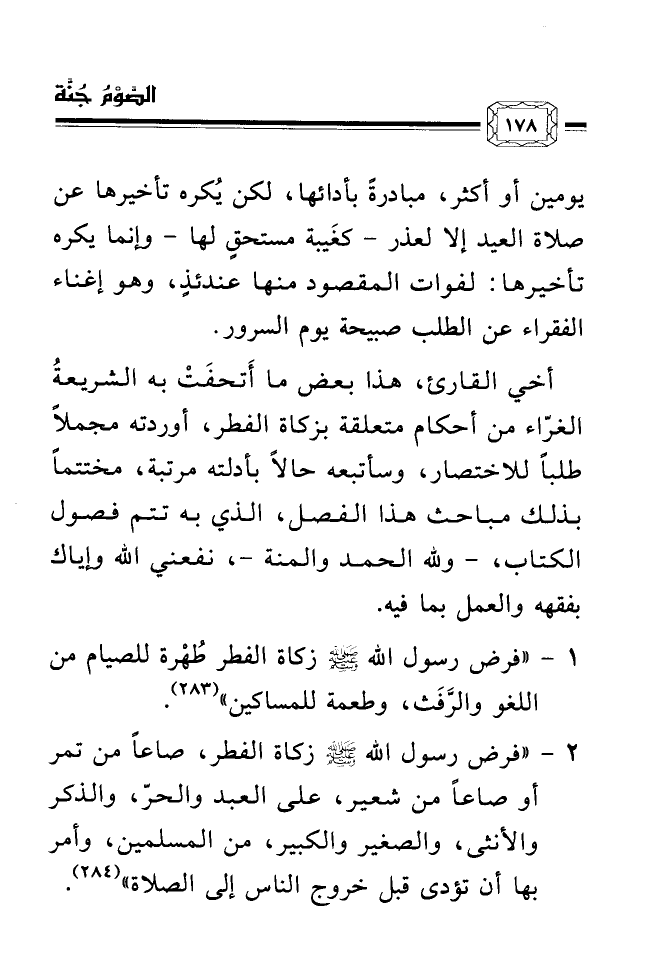 أخي القارئ، هذا بعض ما أَتحفَتْ به الشريعةُ الغرّاء من أحكام متعلقة بزكاة الفطر، أوردته مجملاً طلباً للاختصار، وسأتبعه حالاً بأدلته مرتبة، مختتماً بذلك مباحث هذا الفصل، الذي به تتم فصول الكتاب، - ولله الحمد والمنة -، نفعني الله وإياك بفقهه والعمل بما فيه.