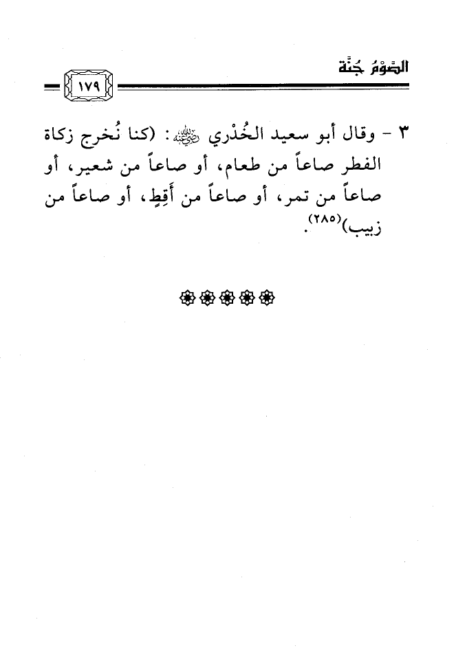 3 - وقال أبو سعيد الخُدْري رضي الله عنه: (كنا نُخرج زكاة الفطر صاعاً من طعام، أو صاعاً من شعير، أو صاعاً من تمر، أو صاعاً من أَقِطٍ، أو صاعاً من زبيب) (¬285) .
