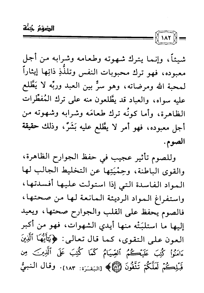 وللصوم تأثير عجيب في حفظ الجوارح الظاهرة، والقوى الباطنة، وحِمْيَتِها عن التخليط الجالب لها المواد الفاسدة التي إذا استولت عليها أفسدتها، واستفراغ المواد الرديئة المانعة لها من صحتها، فالصوم يحفظ على القلب والجوارح صحتها، ويعيد إليها ما استلبَتْه منها أيدي الشهوات، فهو من أكبر العون على التقوى، كما قال تعالى: {يَاأَيُّهَا الَّذِينَ آمَنُوا كُتِبَ عَلَيْكُمُ الصِّيَامُ كَمَا كُتِبَ عَلَى الَّذِينَ مِنْ قَبْلِكُمْ لَعَلَّكُمْ تَتَّقُونَ *} [البَقَرَة: 183] . وقال النبيُّ