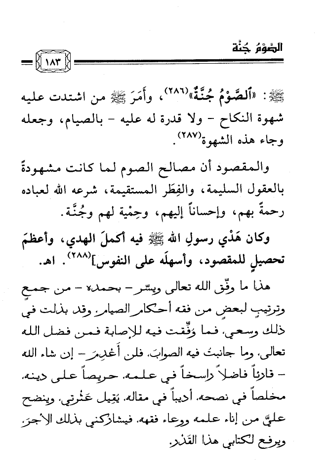 هذا ما وفّق الله تعالى ويسّر - بحمده - من جمعٍ وترتيبٍ لبعضٍ من فقه أحكام الصيام، وقد بذلت في ذلك وسعي، فما وُفِّقت فيه للإصابة فمن فضل الله تعالى، وما جانبتُ فيه الصوابَ، فلن أَعْدِمَ - إن شاء الله - قارئاً فاضلاً راسخاً في علمه، حريصاً على دينه، مخلصاً في نصحه، أديباً في مقاله، يُقِيل عَثْرتي، وينضح عليَّ من إناء علمه ووعاء فقهه، فيشاركني بذلك الأجرَ، ويرفع لكتابي هذا القَدْر.