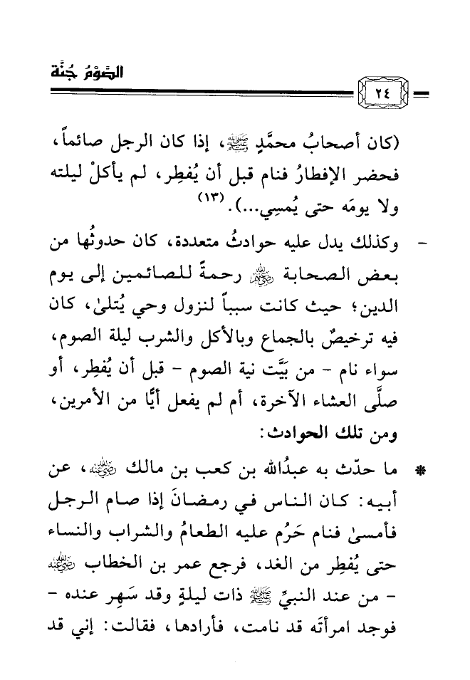 * ... ما حدّث به عبدُالله بن كعب بن مالك رضي الله عنه، عن أبيه: كان الناس في رمضانَ إذا صام الرجل فأمسى فنام حَرُم عليه الطعامُ والشراب والنساء حتى يُفطِر من الغد، فرجع عمر بن الخطاب رضي الله عنه - من عند النبيِّ صلى الله عليه وسلم ذات ليلةٍ وقد سَهِر عنده - فوجد امرأتَه قد نامت، فأرادها، فقالت: إني قد