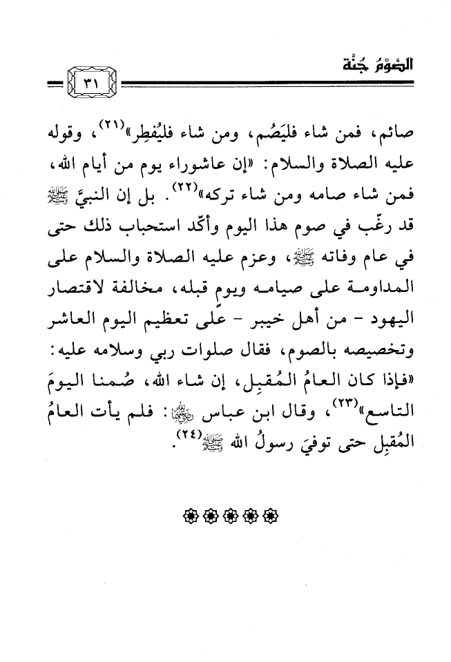 صائم، فمن شاء فليَصُم، ومن شاء فليُفطِر» (¬21) ، وقوله عليه الصلاة والسلام: «إن عاشوراء يوم من أيام الله، فمن شاء صامه ومن شاء تركه» (¬22) . بل إن النبيَّ صلى الله عليه وسلم قد رغّب في صوم هذا اليوم وأكّد استحباب ذلك حتى في عام وفاته صلى الله عليه وسلم، وعزم عليه الصلاة والسلام على المداومة على صيامه ويومٍ قبله، مخالفة لاقتصار اليهود - من أهل خيبر - على تعظيم اليوم العاشر وتخصيصه بالصوم، فقال صلوات ربي وسلامه عليه: «فإذا كان العامُ المُقبِل، إن شاء الله، صُمنا اليومَ التاسع» (¬23) ، وقال ابن عباس رضي الله عنهما: فلم يأت العامُ المُقبِل حتى توفيَ رسولُ الله صلى الله عليه وسلم (¬24) .