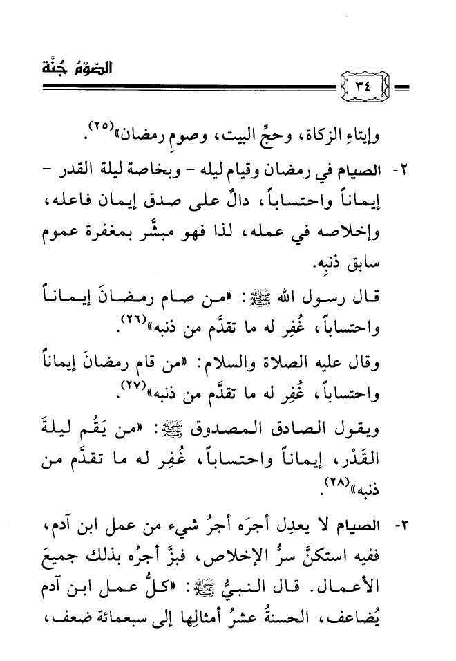 3- ... الصيام لا يعدِل أجرَه أجرُ شيء من عمل ابن آدم، ففيه استكنَّ سرُّ الإخلاص، فبزَّ أجرُه بذلك جميعَ الأعمال. قال النبيُّ صلى الله عليه وسلم: «كلُّ عمل ابن آدم يُضاعف، الحسنةُ عشرُ أمثالِها إلى سبعمائة ضعف،
