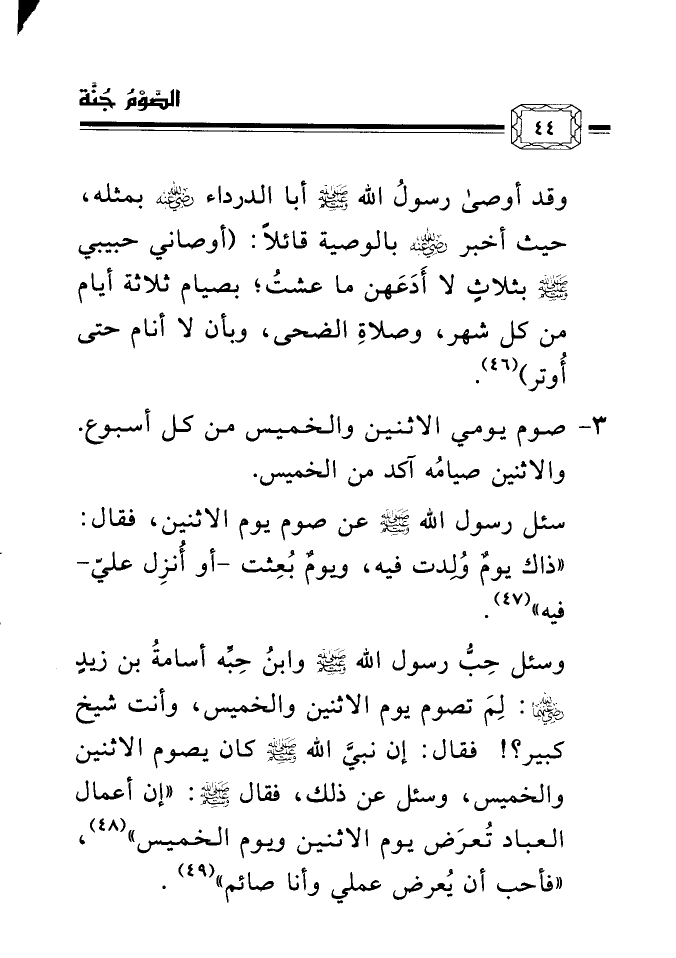 (¬48) أخرجه أبو داود؛ كتاب الصيام، باب في صوم الاثنين والخميس، برقم (2436) ، عن أسامةَ ابنِ زيدٍ رضي الله عنهما.