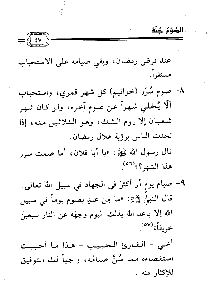 قال رسول الله صلى الله عليه وسلم: «يا أبا فلان، أما صمت سرر هذا الشهر؟» (¬56) .