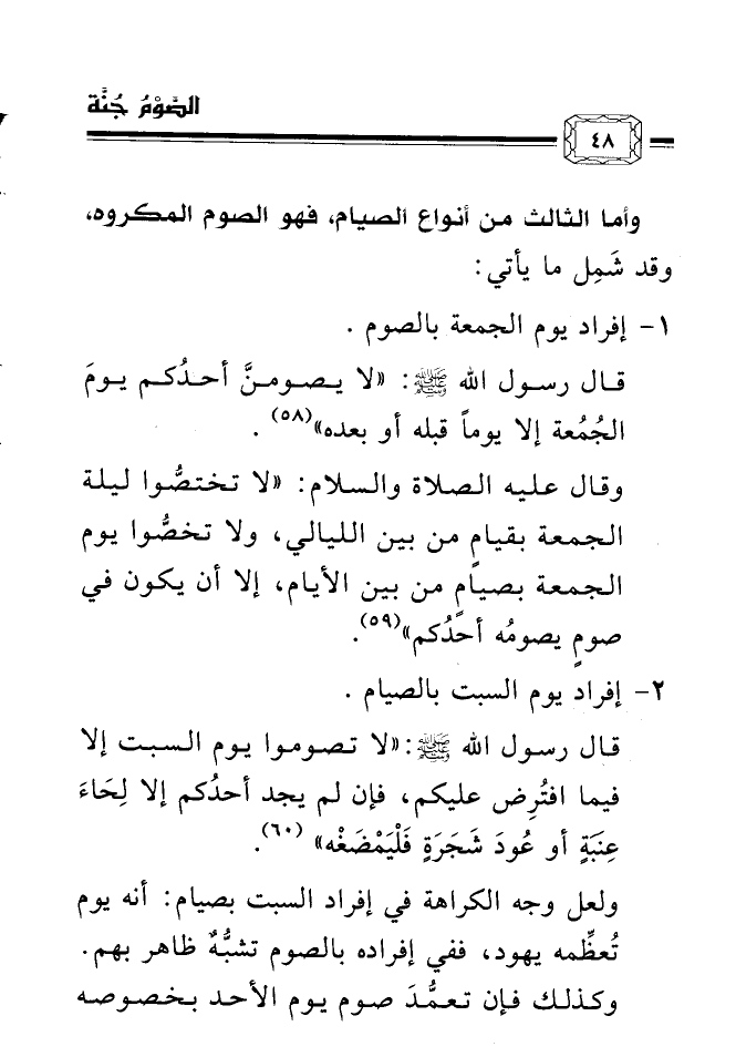 وقال عليه الصلاة والسلام: «لا تختصُّوا ليلة الجمعة بقيامٍ من بين الليالي، ولا تخصُّوا يوم الجمعة بصيامٍ من بين الأيام، إلا أن يكون في صومٍ يصومُه أحدُكم» (¬59) .
