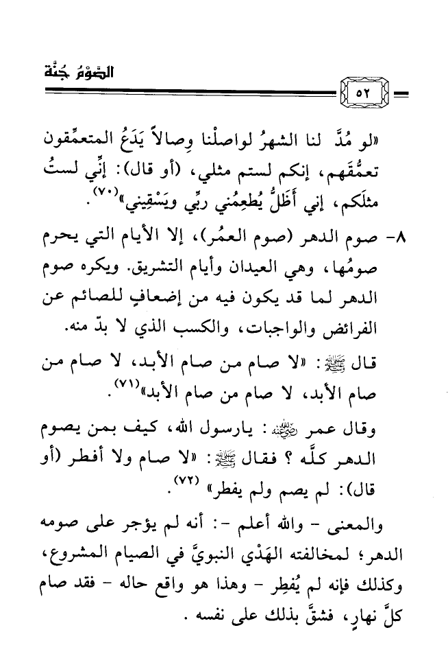 (¬71) جزء من حديث متفقٍ عليه من حديث عبد الله بن عمرو رضي الله عنهما: أخرجه البخاري؛ كتاب الصوم، باب: حق الأهل في الصوم، برقم (1977) . ومسلم؛ كتاب الصيام، باب النهي عن صوم الدهر، برقم (1159) . وتكرار العبارة: «لاَ صَامَ مَنْ صَامَ الأَبَد» ثلاثاً عند مسلم، ومرتين عند البخاري.