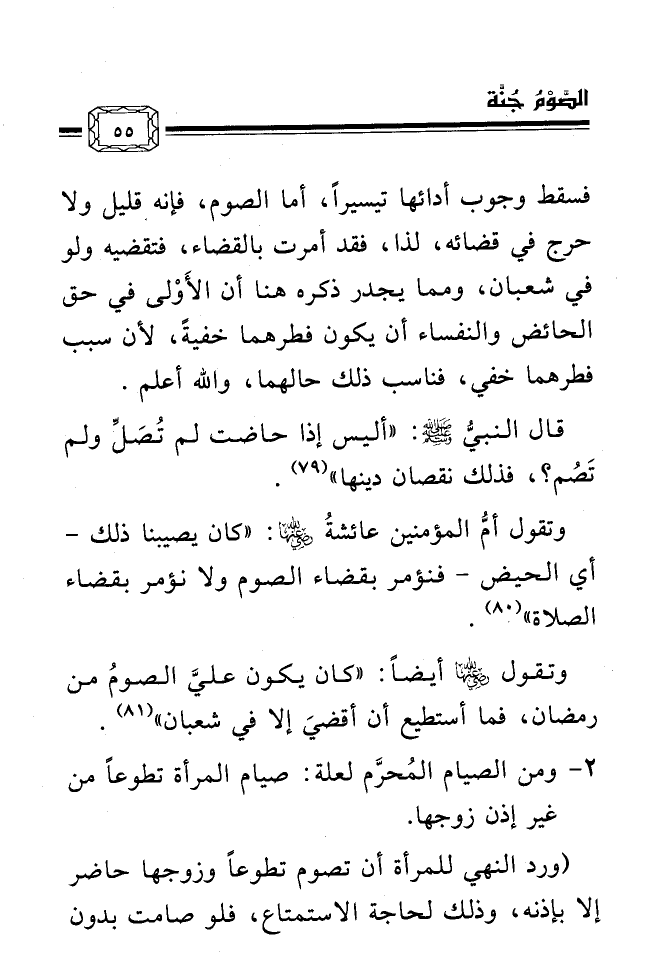 وتقول أمُّ المؤمنين عائشةُ رضي الله عنها: «كان يصيبنا ذلك - أي الحيض - فنؤمر بقضاء الصوم ولا نؤمر بقضاء الصلاة» (¬80) .
