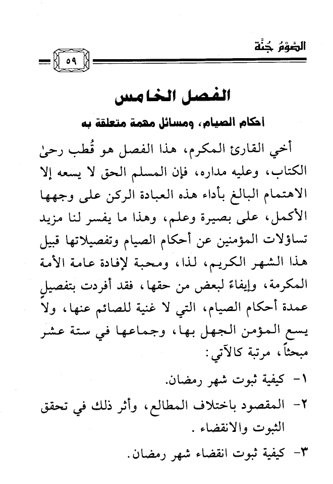 أخي القارئ المكرم، هذا الفصل هو قُطب رحى الكتاب، وعليه مداره، فإن المسلم الحق لا يسعه إلا الاهتمام البالغ بأداء هذه العبادة الركن على وجهها الأكمل، على بصيرة وعلم، وهذا ما يفسر لنا مزيد تساؤلات المؤمنين عن أحكام الصيام وتفصيلاتها قبيل هذا الشهر الكريم، لذا، ومحبة لإفادة عامة الأمة المكرمة، وإيفاءً لبعض من حقها، فقد أفردت بتفصيلٍ عمدة أحكام الصيام، التي لا غنية للصائم عنها، ولا يسع المؤمن الجهل بها، وجماعها في ستة عشر مبحثاً، مرتبة كالآتي: